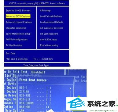 7、重启电脑,开机后第一个画面,按F2(根据电脑主板而定,有些是按其他键的),进入Bios界面(或按F12热键直接选择UsB启动), 将UsB启动选择为第一启动,一般为+向上,-向下,F10为保存并退出;