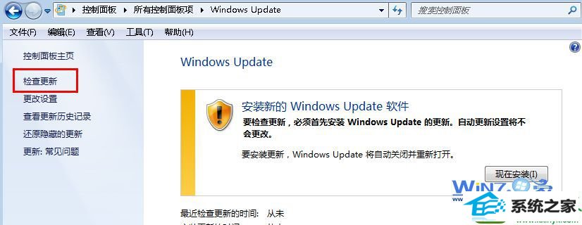 4、接着再去控制面板中的“windows Update”检查更新并安装iE至最新更新的就可以了。