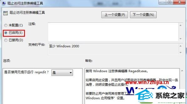 7、如果我们要使用注册表时,可以在阻止访问注册表编辑工具窗口中,把已启用更改为:已禁用,然后点击:确定,就可以解除锁定注册表编辑器;