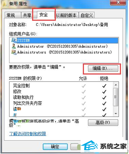 2、在属性窗口中,点击“安全”选项标签,然后点击“编辑”,如图所示: