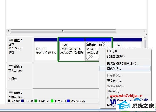 3、接着鼠标右击想要格式化的分区(卷),然后选择“格式化”选项;