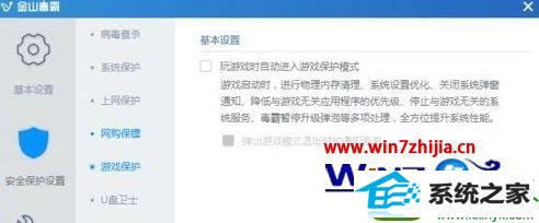 2、在安全保护设置——游戏保护中,如果勾选“玩游戏时自动进入游戏保护模式”,每次打开游戏金山毒霸都会在右下角提示已开启游戏保护模式,退出游戏时又会提示已释放资源,如果你觉的这个提示也很烦人也可以关闭,可根据个人情况具体设置;