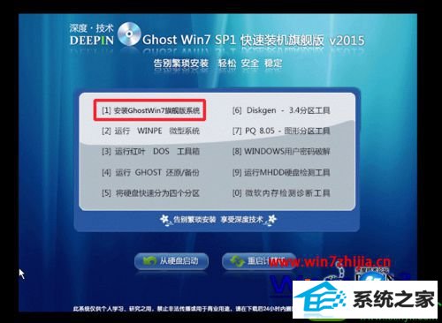 7、然后再次回到系统工具箱,我们选择第一个,将系统安装在我们的分盘上,直接按”1“键就可以了,你也可以使用鼠标操作。
