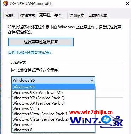 5、再点上面的兼容性那个选项。勾上“以兼容模式运行这个程序”再在下面选一个操作系统。就95可以,大家也可以都试试。