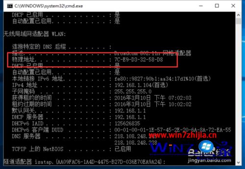4、运行ipconfig /all命令后,即可产看电脑网卡的相关信息,在下面找到一项“物理地址”后面的数字串就是此电脑的MAC地址了。