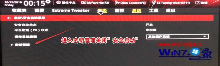 2、进入高级模式后,按→方向键移动到"启动"选项,选择安全启动菜单;win7系统之家 www.xiazaima.com