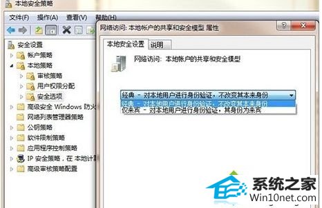 4、然后系统默认以guest用户登录,无法更改时,点击“本地策略”选择“安全选项”,然后更改策略"网络访问: 本地帐户的共享和安全模式" 为经典模式即可;