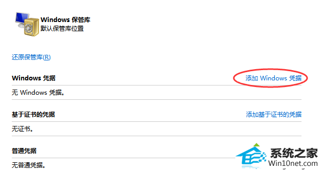 3.接下来在系统弹出来的窗口里面,我们用鼠标点击进入凭证管理器,接着我们点击windows平局后面的添加windows凭证选项。