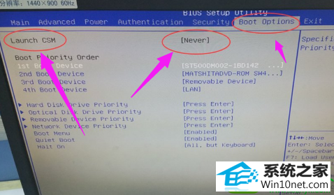 这个是由于开启了安全boot模式验证导致boot options 项下的Launch CsM,为不可更改 灰度状态 never。