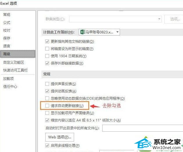 1、点击“选项-高级”,然后把“自动更新链接”勾选去除;