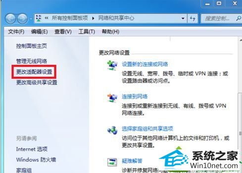 三、修改电脑dns返回到第二步的【网络和共享中心】界面,在左侧找到【更改适配器设置】并点击。