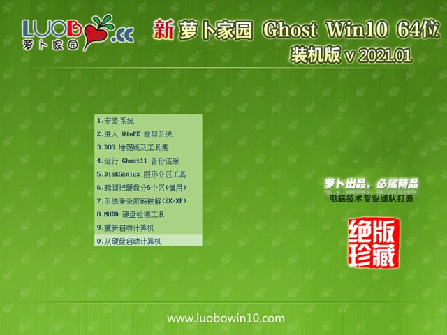 萝卜家园Ghost Win10 64位 官网2021元旦装机版用全新的激活机制,安装好即激活,若未激活,可在开始菜单—装机工具—使用激活工具手动激活,优化网页访问,提高网页加载速度和视频播放流畅度,系统具有全自动无人值守安装功能,让技术员轻松应对多台电脑的安装,系统安装全过程约8分钟,部分机子可达5分钟,高效的装机过程,自动清除启动项:显卡启动项,声卡启动项只运行一次,第二次重启即可清除,未经数字签名的驱动可以免去人工确认,使这些驱动在进桌面之前就能自动安装好。